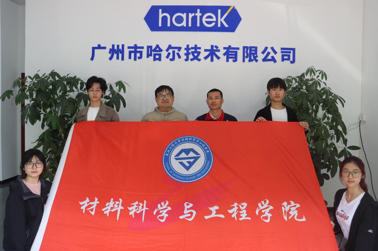 实践团首站探访了国家专精特新“小巨人”企业——广州市哈尔技术有限公司。作为深耕高分子材料绿色循环领域的标杆企业,哈尔技术凭借其核心技术,构建了从设备研发到工艺优化的全链条解决方案,以科技赋予废弃材料“重生”的新生力量。在企业工程师的引领下,材料学子们深入生产一线,近距离探秘双螺旋挤出与催化降解两大核心设备的“硬核科技逻辑”。当工程师在催化降解装置前演示废弃材料的循环转化过程,并讲述反应装置背后多年的研发坚守时,其袖口沾染的污渍,成为科研人执着追求的生动写照。