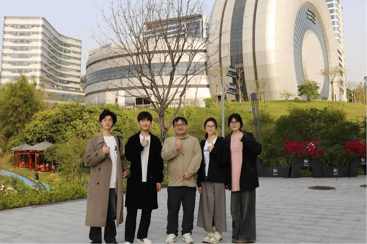 研学尾声,实践团成员与基地科研人员一同手持院旗,在科创氛围浓厚的实验室集群前合影,让院旗在大湾区科创高地留下闪亮印记。