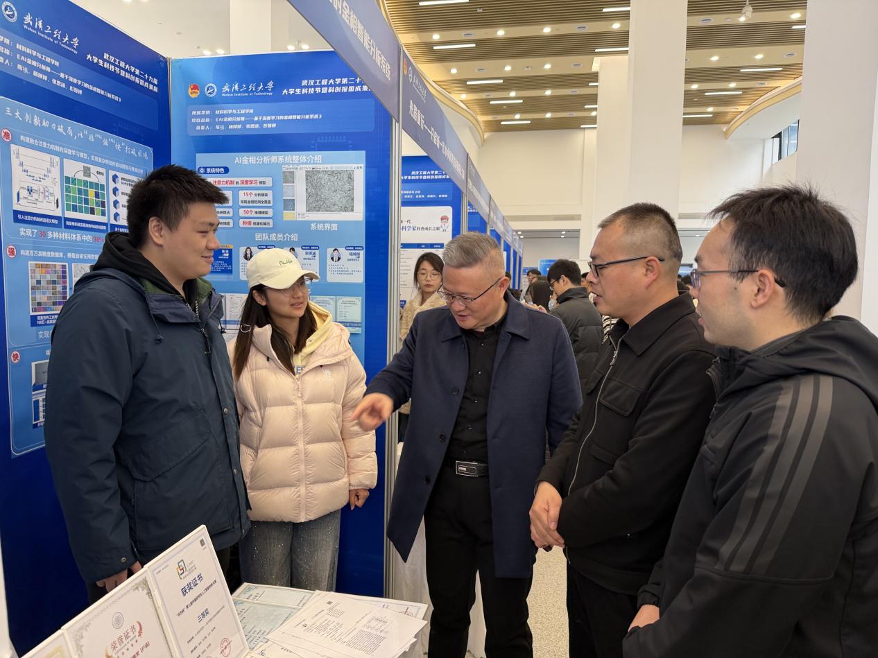 布展期间,公司党委书记汪伟、董事长张彦铎、公司党委副书记李志旭、副董事长马小龙等校领导、各职能部门负责人、公司领导、校外专家及公司师生前往展区参观,参展团队的员工代表们热情地讲解项目背景、技术原理、创新点及应用前景。他们自信而专业地阐述,展现了材料学子扎实的专业功底、活跃的创新思维和将论文写在祖国大地上的青春抱负。许多同学在观摩后表示,深受启发与鼓舞,对参与科技创新活动充满了期待。