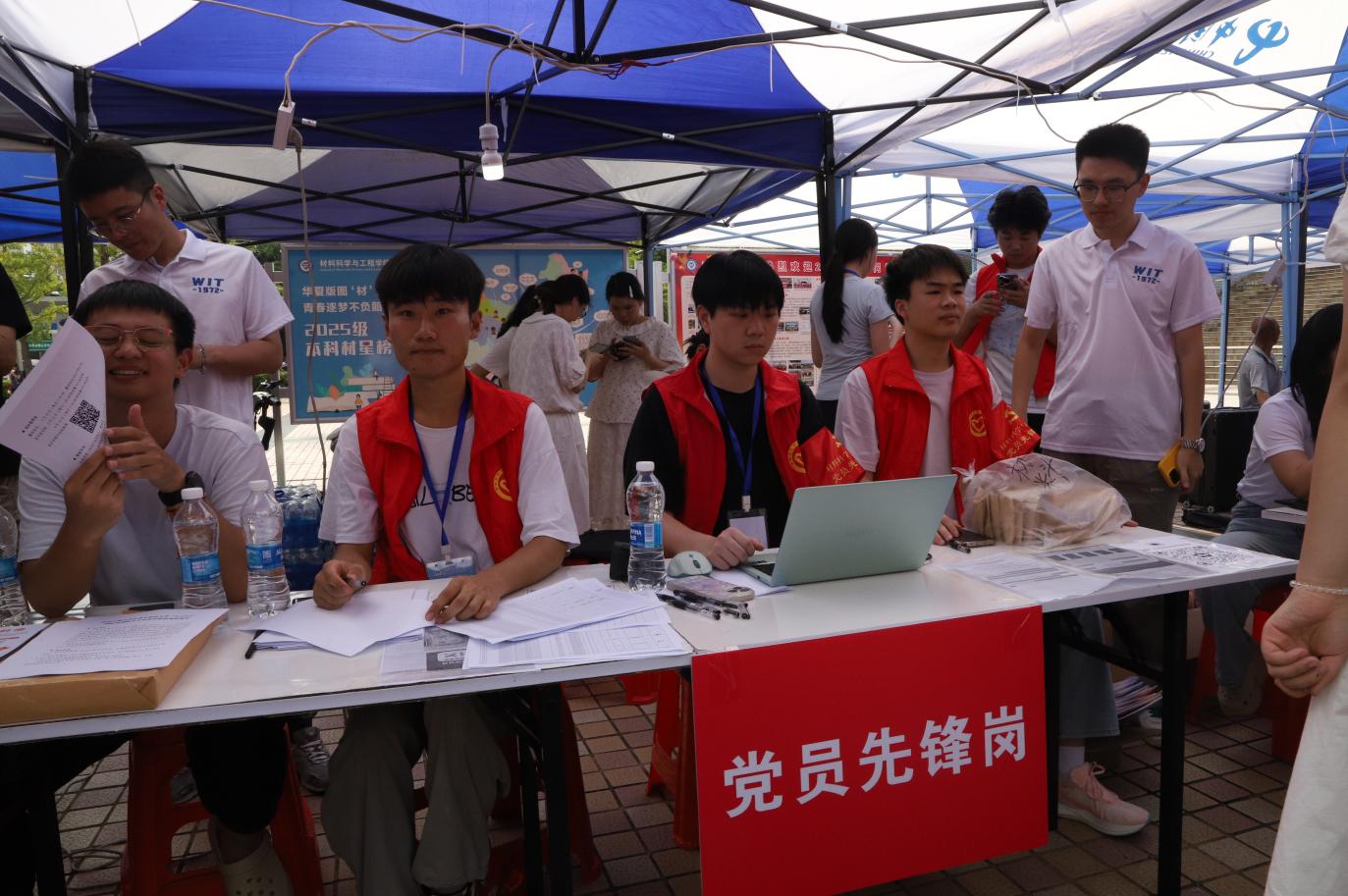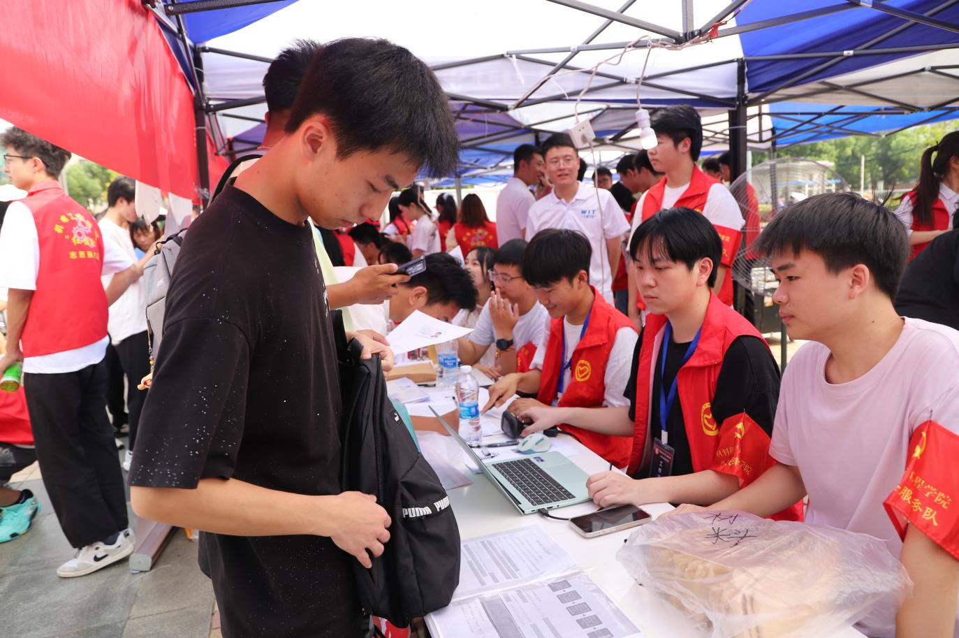 新生报到当日,校园里随处可见党员先锋岗志愿者们忙碌的身影。他们身着统一的志愿服装,佩戴醒目的“党员先锋”袖标,在公司迎新点、宿舍楼下、校园主干道等关键位置设立服务站点,形成了一条“点对点”的迎新服务链。在报到处,志愿者们耐心细致地为新生及家长讲解报到流程,协助完成身份核验、材料收取、校园卡激活等手续,引导新生快速完成报到;在行李搬运区,他们主动上前接过新生手中沉重的行李箱,无论是装满书籍的背包,还是塞满衣物的行李箱,志愿者们都二话不说扛在肩上、提在手中,穿梭在校园的各个角落,将行李安全送到新生宿舍;面对新生和家长关于专业学习、校园生活、社团活动等方面的疑问,志愿者们结合自身经历,用亲切的语言一一解答,为新生搭建起了解大学的“第一座桥梁”。