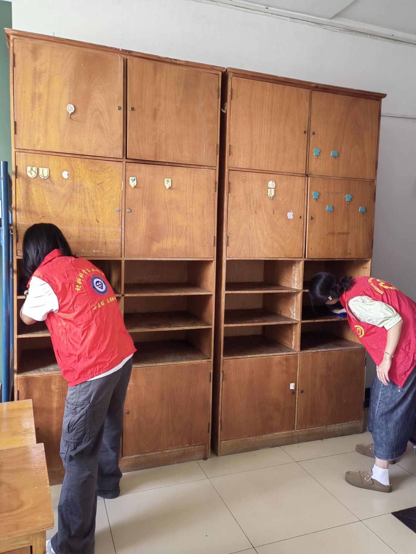 新生入学前,党员先锋岗的志愿者们便提前行动,化身“宿舍暖心管家”。他们主动带着清洁工具深入每一间新生宿舍,对地面、书桌、衣柜、阳台等区域进行全方位清扫。从擦拭积尘的窗台,到整理归置床铺被褥,再到检查水电设施是否完好,志愿者们不放过任何一个细节,用抹布擦拭的每一个角落、用扫帚清扫的每一寸地面,都承载着对新生的殷切期待。