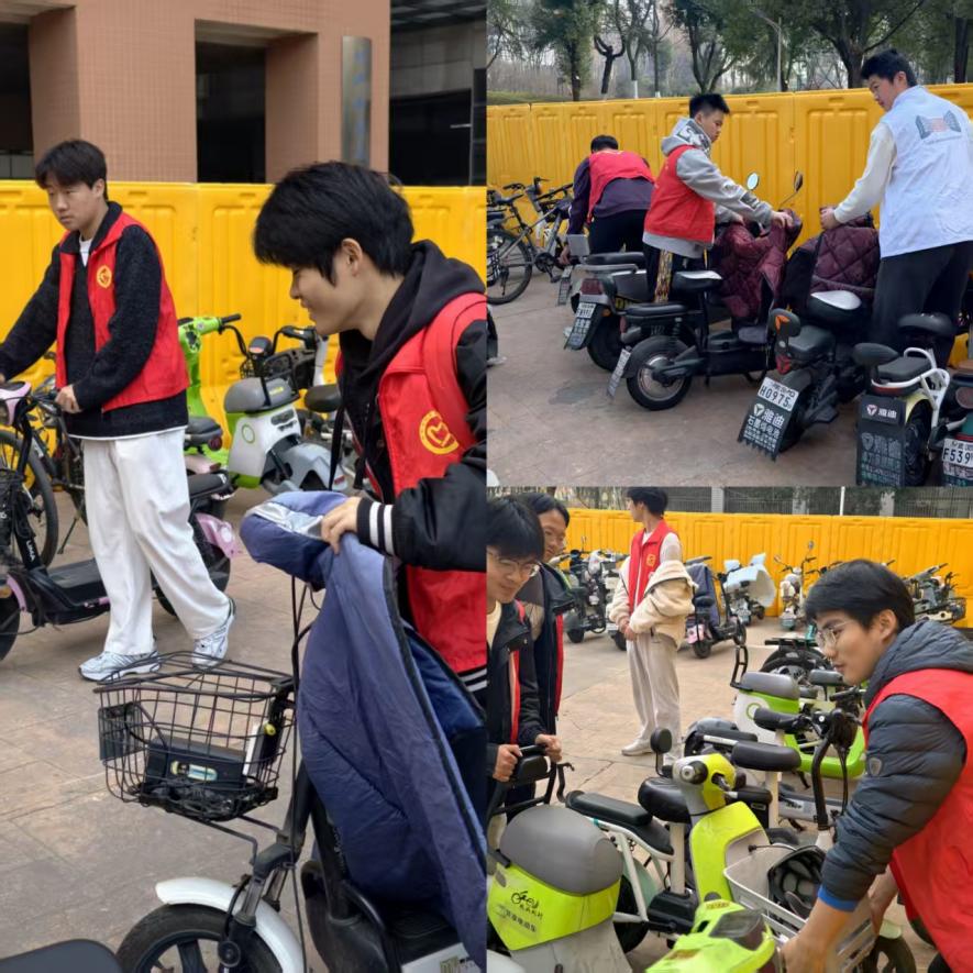 活动现场,志愿者们迅速分工、默契协作,全身心投入整治工作。他们或弯腰扶起倾倒的电动车,或俯身清理停放区周边散落的杂物并分类投放至垃圾桶;对摆放歪斜、超出划定区域的车辆,细心调整角度、规范排列;对来往师生,主动上前引导规范停车。遇到车身较重、难以移动的车辆,志愿者们便三四人一组合力抬运,干劲十足。