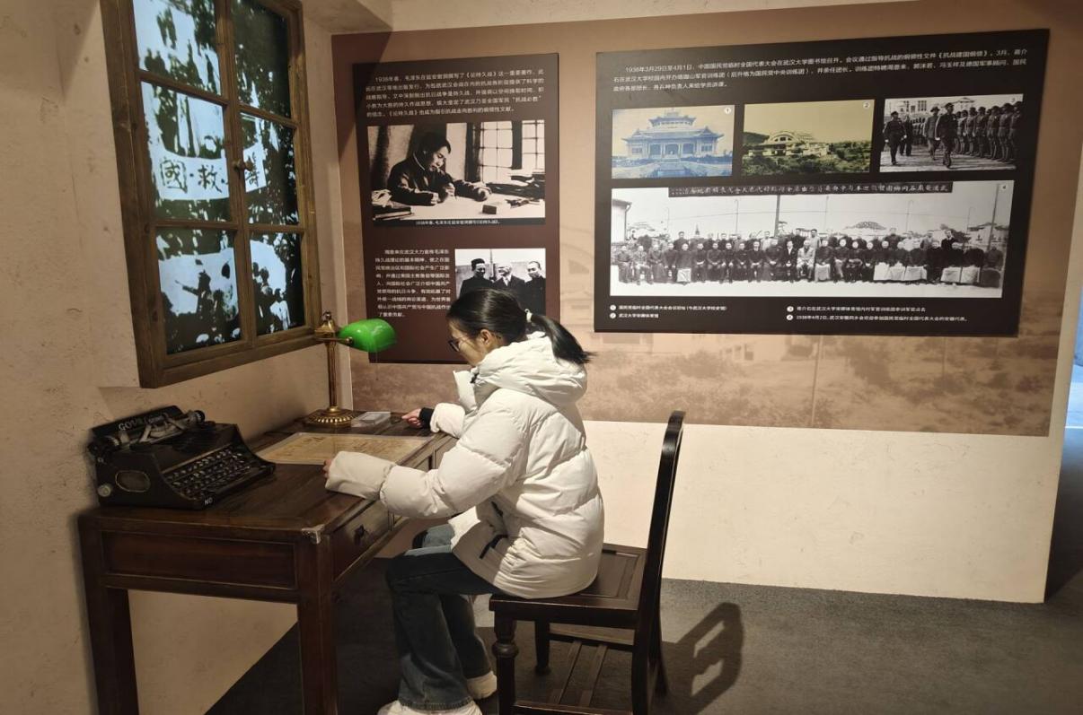推开纪念馆的大门,时光仿佛倒流回峥嵘岁月。泛黄的文献资料、珍贵的历史照片、复原的革命场景,无声诉说着中共中央在武汉领导中国革命的光辉历程,从大革命时期的艰苦探索到革命先辈的坚定信仰,每一个细节都深深触动着大家。在中共中央机关办公旧址复原展区,实践团四人俯身观察桌椅陈设,想象着革命先辈们在此彻夜工作、擘画革命蓝图的场景,真切体会到当年革命工作的不易与伟大。