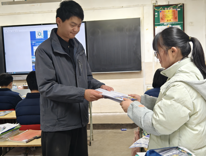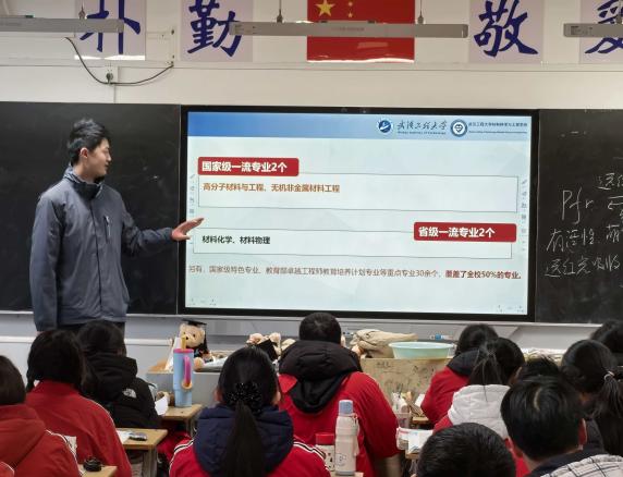 1月20日上午,王汤培走进安庆二中高三(8)班教室,用PPT进行专场宣讲。他先介绍yl34511线路中心办学特色与核心学科实力,接着详细介绍yl34511线路中心团队、实验室建设成果和科创竞赛成绩,还延伸到校企合作资源、就业前景等受关注话题。每项内容配具体案例与详实数据,清晰呈现武工大的学科优势,让同学们对理想院校认识更清晰,为高考备考明确方向、注入动力。