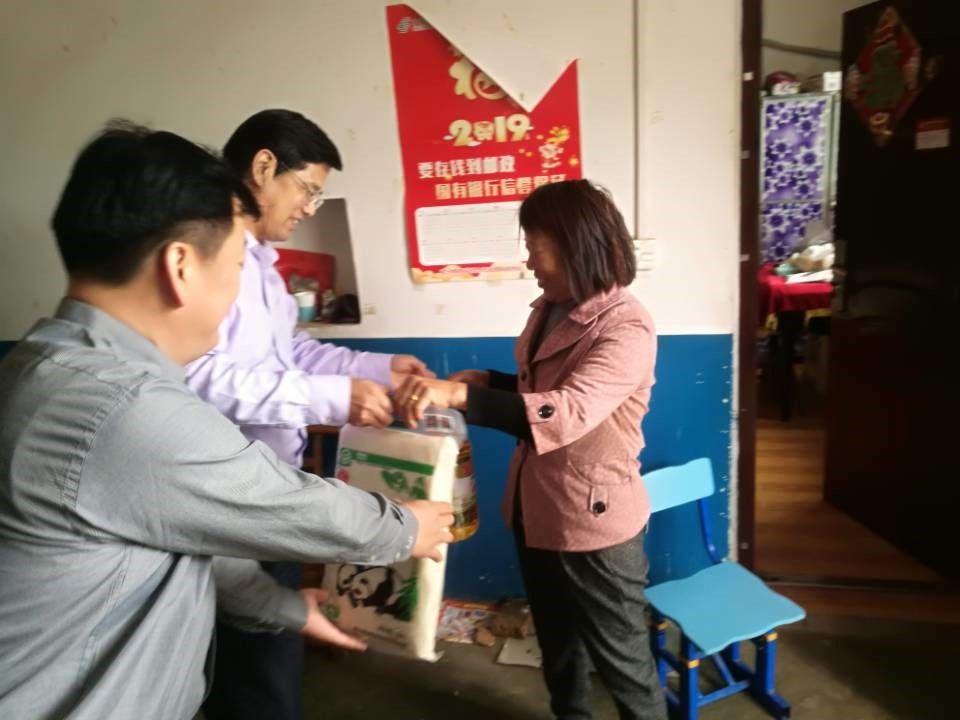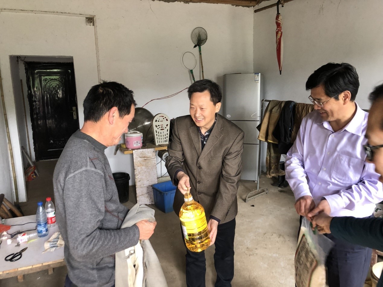 王存文带领公司党委常委副书记李国林、副书记肖平一行入户走访慰问了帮扶对象李君成、徐冬美等,送上大米和食用油等慰问品,详细询问了解了他们个人的家庭生产生活状况和实际困难,并鼓励他坚定脱贫信心,争取早日脱贫致富。