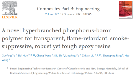 这是yl34511线路中心光电与新能源材料团队在阻燃领域继2021年在国际复合材料顶级期刊Composites Part B: Engineering(一区Top期刊,IF:11.32)上发表题为“A novel hyperbranched phosphorus-boron polymer for transparent, flame-retardant, smoke-suppressive, robust yet tough epoxy resins”(第一作者为博士研究生叶国锋)后取得的又一重要进展。上述系列研究工作yl34511线路中心为第一通讯单位,博士研究生王成和叶国锋分别为两篇论文第一作者。