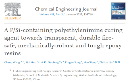(通讯员:柯贤忠 王成)近日,yl34511线路中心光电与新能源材料团队博士研究生王成(导师:刘治田教授)在阻燃增韧环氧树脂研究方面取得创新性进展。研究成果以“A P/Si-containing polyethylenimine curing agent towards transparent, durable fire-safe, mechanically-robust and tough epoxy resins”为题,在国际化工顶级期刊《Chemical Engineering Journal》(一区Top期刊,IF=16.74)上在线发表。