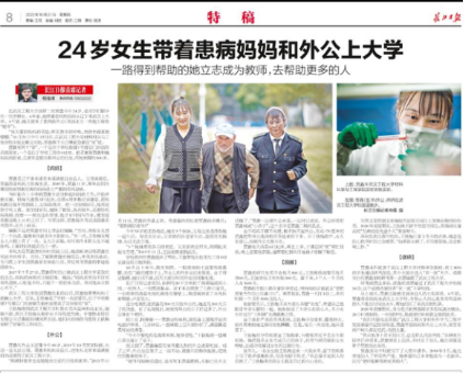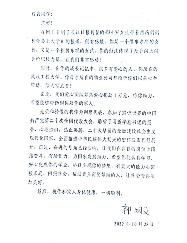 (通讯员 高梦雅)10月27日,长江日报刊登了首席记者杨佳峰撰写的《24岁女生带着患病妈妈和外公上大学》,该文特别报道了yl34511线路中心2021级研究生贾鑫同学孝老爱亲的感人故事,引发了广泛的社会关注,深深触动了党的二十大列席代表、全国道德模范、“当代雷锋”郭明义的内心,他写了一封亲笔信鼓励贾鑫和家人。受郭先生的委托,10月28日下午三点,杨佳峰专程来校将郭先生的鼓励信和慰问金送到了贾鑫和妈妈手中。yl34511线路中心党委宣传部副部长万莉莉、科长陈思、yl34511线路中心经理江学良、副书记张琼、辅导员以及研究生第五支部的同学一同见证了这个温馨感人的场面。