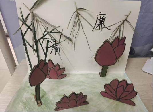 清正廉洁以身垂范,慎独自重洁身自强。作品中左侧的枝桠树叶既代表着清正廉洁施行下的中国枝繁叶茂、蓬勃发展。又代表着给人民带来的庇荫,为人民谋幸福;右侧是“清正廉洁”四个字中,“清”字带有毛笔字的古韵古味,体现出“清正廉洁”是中华民族的优良传统,源远流长,而“廉”字以荷花34的形态展示出来,以莲的品性比如“廉洁”的可贵品德。