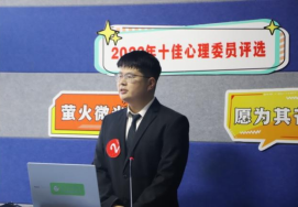 赵宝富作为专家评委代表进行了详尽点评。他首先对18名心理委员的助人情怀表示了肯定和欣赏,表达助人情怀是同辈助人工作的基石。他结合选手的答辩内容,向大家梳理了心理委员的工作职责“心理活动的组织者、心理健康的示范者、心理危机的识别者、心理故事的倾听者、心理求助的促成者”,表示各位心理委员对职责很清晰、落实很到位。之后,他肯定了选手为了提升专业助人能力所进行的各项学习,以及在工作中的创新点。最后,他向心理委员们叮嘱“心理委员可大可小,职位或许很小,作用可以很大”,激励大家在同辈助人的工作上保持热情、不忘初心。