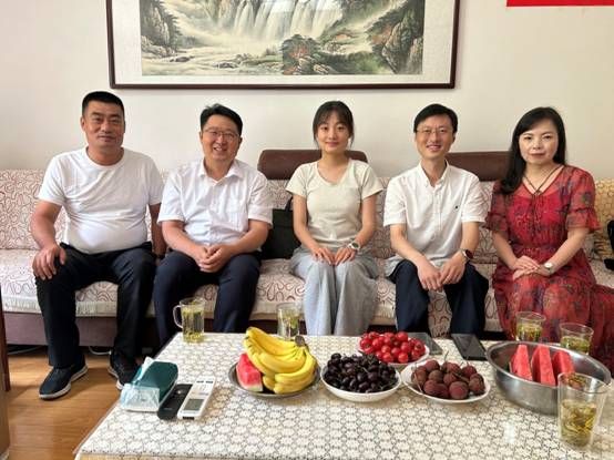 王立彬和王涛围绕员工在校学习、生活、思想动态和未来规划与小赵一家亲切交谈。小赵向老师们汇报了自己大一学年的基本情况,在听到她不仅学习认真、成绩优异,还积极参加各类活动,担任了年级长、班级团支书,热心为同学们服务,王立彬频频点赞,并详细询问了她在校期间的收获,鼓励她要在提高学业成绩的同时,多多参加竞赛,跟随导师参与项目,科学制定学习计划,脚踏实地,每天进步一点点。