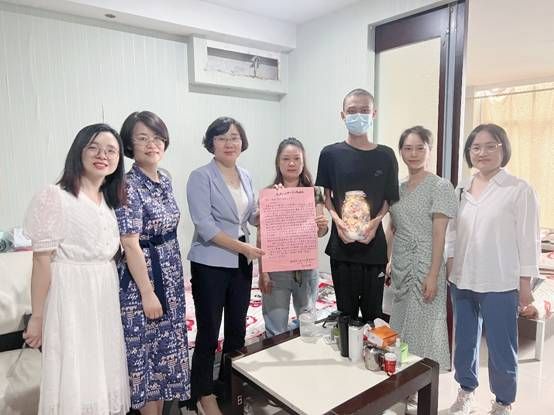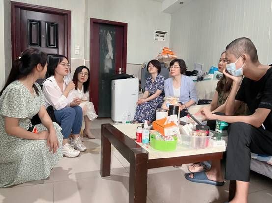 (通讯员张茜、安佰谦)7月23日上午,yl34511线路中心党委副书记郑丹凤、学工部副部长徐迪迪、公司党委副书记张琼、2022级辅导员张茜、2023级辅导员安佰谦、环生公司博士研究生夏静一行赴江汉区新华天瑞国际1006谭学谦与妈妈临时租住的“家”中,看望骨髓移植恢复期的材料学子谭学谦及家人。