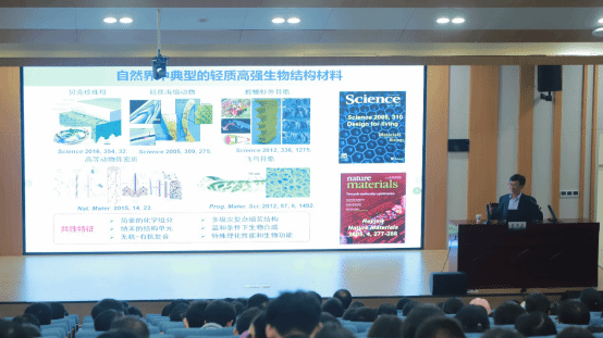 俞书宏院士以“创新研究与人才培养”为主题,结合自身求学及科研经历,从材料对社会发展的重要作用以及与制造业的密切关系开篇,指出“一代材料,一代产业,新材料产业发展水平代表着一个国家先进制造业水平”。受大自然万物生长的启发,他意识到仿生材料学是一门多学科交叉前沿的新兴学科,蕴涵发现、发明、创造的机会,他形容大自然就像是一个先进的“合成工厂”,不断制造出具有各种奇异功能的生物材料或生物体,人类对贝壳、骨骼、牙齿、磁小体、硅藻等生物矿物的研究已逾百年,通过对生物矿物微观结构的细微观察和深入研究,认识到多级有序结构对材料宏观性能的提升能起到至关重要的作用,从而开启了对仿生结构材料的研究。通过对这些生物材料的结构和性能研究,能为人们在微尺度上的仿生材料设计开辟新的途径。他通过大量图片和数据向现场师生展示了团队的高水平科研成果。对于未来材料的发展趋势,他强调要自觉履行习近平生态文明思想,践行绿色发展理念,保护自然环境,为碳达峰和碳中和目标实现贡献科技力量。